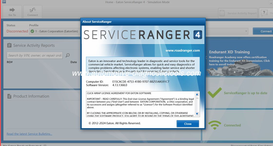 Eaton Service Ranger 4.13 Marke: Eaton Aktualisierung: 2025 Version: v4.13 Kategorie: LKW und schwere LKW Dateigröße: 1,2 GB Typ der Software: DIAGNOSTIC Region: Alle Regionen Betriebssystem: WINDOWS 10/11 (64 BITS) Sprache der Datenbank: DEISCH Schnittstellensprache:Englisch, Französisch, Spanisch 1.Eaton Service Ranger 4.13 ist ein Diagnose- und Service-Tool für Eaton automatische Getriebe. 2Es bietet Funktionen wie Fehlercode-Lesung, Datenüberwachung, Service-Aktivitätsberichterstattung und Kupplungskalibrierung sowie die Möglichkeit, Software zu aktualisieren und Konfigurationseinstellungen zu ändern. 3Eine wichtige Neuerung in Version 4.13 ist der Connection Wizard, der den Anschluss an die TECU und TCM eines Fahrzeugs vereinfacht.
